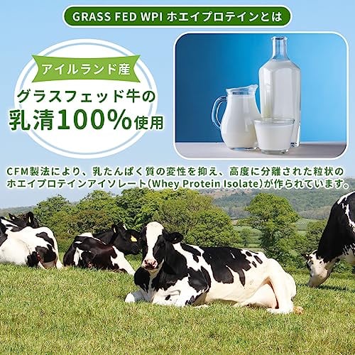 アイルランド産の信頼できる酪農家のもと、広大な自然の中で放牧され、成長ホルモン剤を一切使用せず、Non-GMO 牧草を食べてストレスなく育った、GRASS FED(グラスフェッド)牛の乳清を使用。CFM製法を使用している為、乳たんぱくの変性を抑え、高度に分離されている造粒したホエイプロテインアイソレイトです。人工香料や人工甘味料などを一切使用せず、天然の成分にこだわって作られました。 | 名称:乳たんぱく加工品 原材料名:乳清たんぱく/ひまわりレシチン(一部に乳を含む)原産国:アイルランド 認証 kosher,halal,Ovo Lact vegetarian 認証原料を使用 | 残留農薬:生乳の定期的なランダムサンプリングプログラムにより農薬、放射性核種、工業化学物、及び有毒物質や動物用医薬品の乳への農薬の検査を実施しております。 日本の食品衛生法、ポジティブリスト制に適合して安全な製品になっております。 | rBGH and rBSTr:BGH(遺伝子組換え牛成長ホルモン)rBST (成長ホルモン剤)その他のホルモン剤が投与されていない乳牛から搾汁されている生乳を使用いていることがされております。 | 栄養成分表示(製品100gあたり) エネルギー370kcal タンパク質(乾物換算)88.9g(93.3g) 脂質0.9g 炭水化物2.5g 食塩相当量0.5g カルシウム530mg マグネシウム120mg 鉄0.9mg